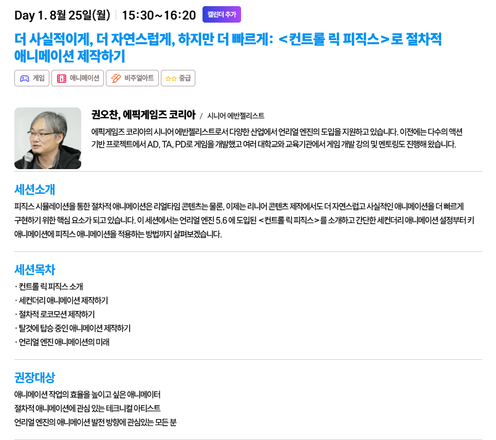 안녕하세요, 크리에이터 여러분! 언리얼 페스트 2025에서 가장 주목받았던 기술 중 하나인 **<컨트롤 릭 피직스>**에 대해 알아보겠습니다. 에픽게임즈 코리아의 권오찬 시니어 에반젤리스트님이 발표하신 이번 세션은, 오랜 기간 동안 정체되어 있던 캐릭터 애니메이션 분야에 새로운 가능성을 제시했어요. 기존에는 복잡했던 절차적 애니메이션을 어떻게 더 쉽고 빠르게 만들 수 있는지, 그 핵심 기술들을 자세히 소개해 드릴게요. 😊