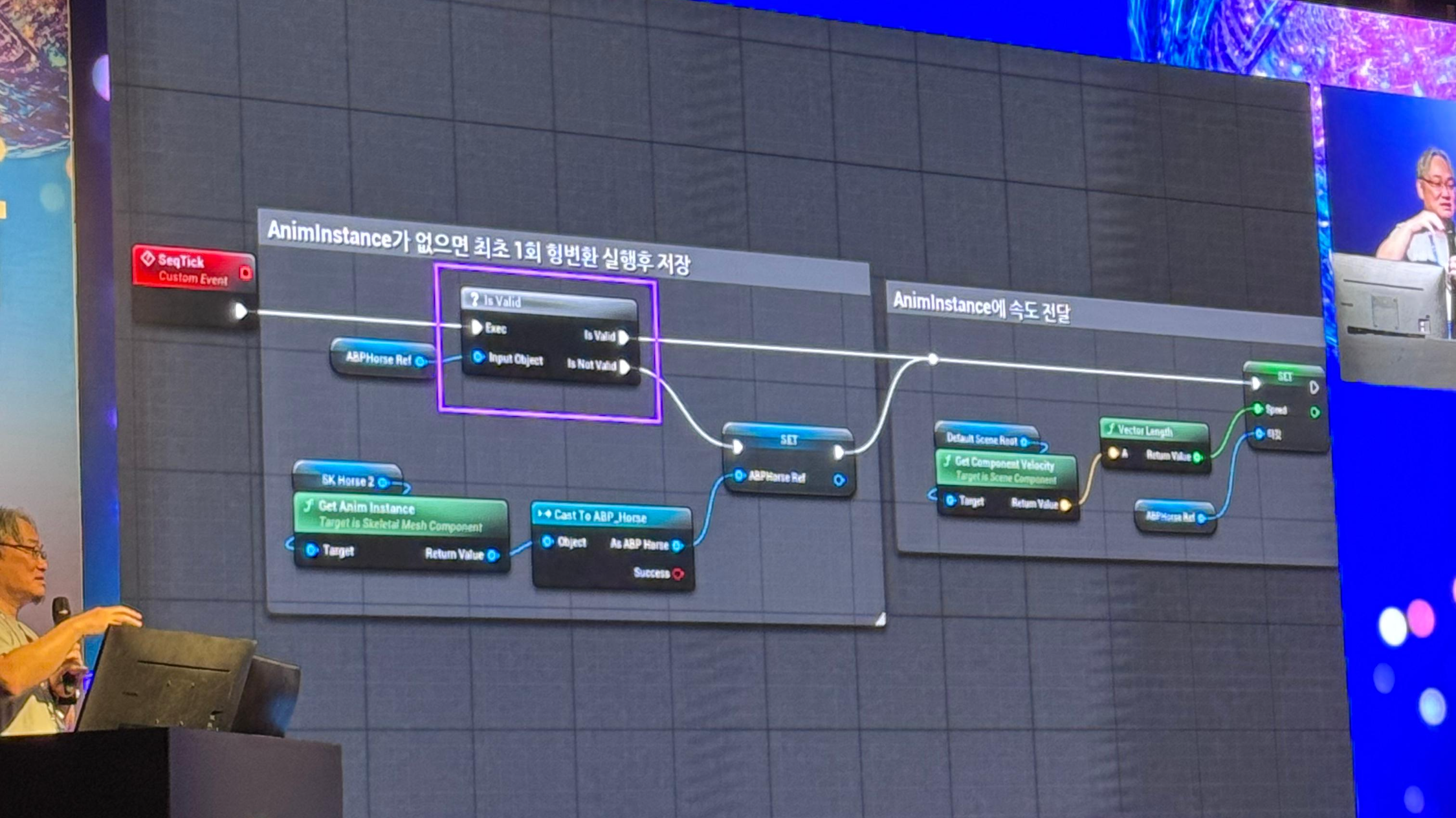 발표자님은 언리얼 엔진 애니메이션의 미래에 대한 흥미로운 이야기도 들려주셨습니다. 개발 예정 기능으로는 **월드 기준 시뮬레이션**과 **피직스 기반 포즈 애니메이션**이 있으며, 내년 하반기에는 **완전한 피직스 기반 애니메이션**을 선보일 예정이라고 합니다. 또한, 애니메이션 포스트 프로덕션 시 두 가지 방법으로 작업할 수 있도록 '투 트랙'으로 개발하고 있다는 점도 인상적이었죠.