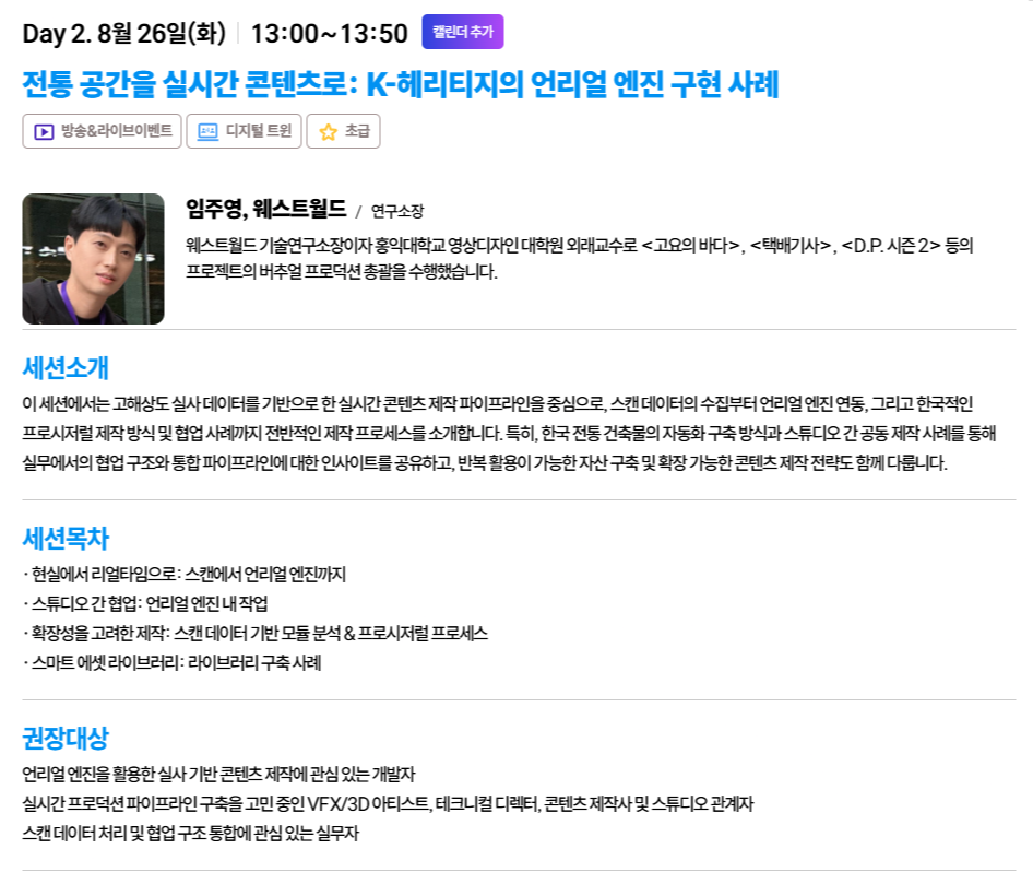 전통 건축물이나 유적지 같은 우리 문화유산을 생생한 디지털 콘텐츠로 만날 수 있다면 어떨까요? 콘텐츠 제작 스튜디오 웨스트월드(WESTWORLD)는 언리얼 엔진을 활용해 이런 상상을 현실로 만들고 있습니다. 이번 세션에서는 웨스트월드 임주영 연구소장님이 발표하신, 실제 공간을 고해상도 스캔 데이터로 수집하고 언리얼 엔진을 통해 실시간 콘텐츠로 구현하는 특별한 제작 파이프라인을 소개하려고 해요. 특히, 효율적인 협업과 확장 가능한 에셋 구축을 위한 노하우는 많은 창작자들에게 큰 도움이 될 것 같습니다. 😊